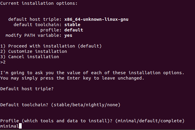 Choose 2) to customize the installation, select default host triple and default toolchain, and choose the minimal profile.
